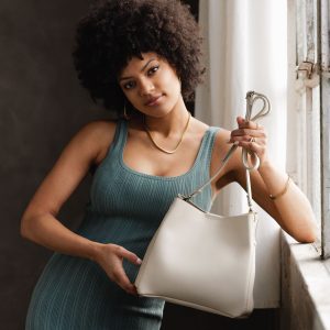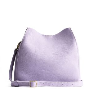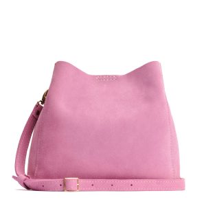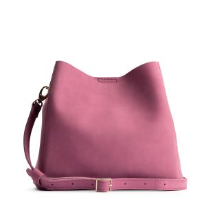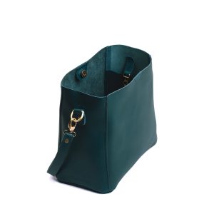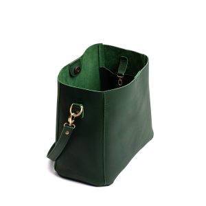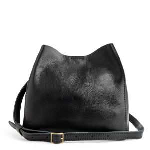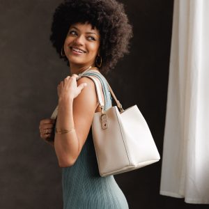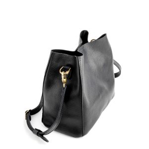 - Spacious bucket shape with delicate brass-toned hardware accents